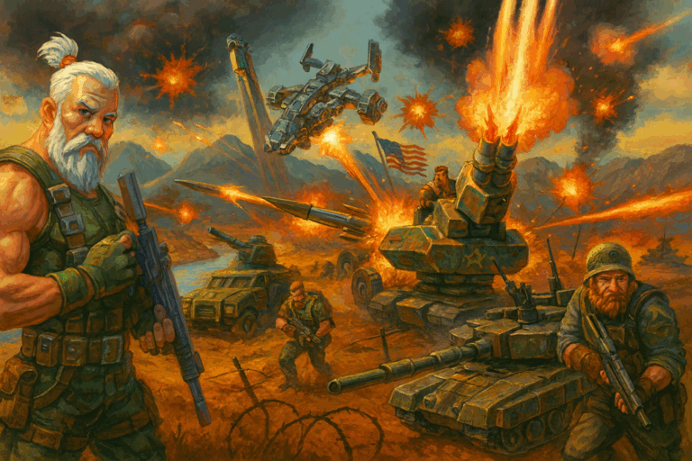 The battlefield roars with the thunder of machines. Mighty tanks carve through scorched earth, neon-lit choppers blaze through the skies, and hovercrafts, like ghost ships from an ancient world, slice across oceans of fire. Mercenary convoys roll into combat blasting heavy metal music, while covert operatives vanish into the smoke of their own legends.